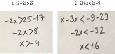 Ahmet Öğretmen, 8. sınıf öğrencilerine eşitsizliklerin nasıl çözüleceğini öğretti. Ancak ders sonunda yaptığı değerlendirme etkinliğinde, sınıftaki öğrencilerin büyük kısmının hata yaptığını gözlemledi. Öğrencilerin çözümlerine ilişkin bazı örnekler aşağıda verilmiştir.