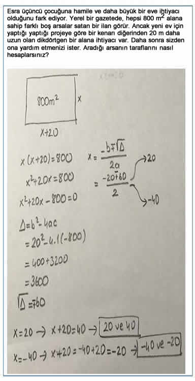 Hafta boyunca, Sibel öğretmen 10. sınıf öğrencilerine ikinci dereceden denklemleri öğretti. Son derste, öğrencilerinin değişkenler için buldukları değerlerin problem için bir çözüm olduğunu anlayıp anlamadıklarının değerlendirmek amacıyla, öğrencilere denklem çözmeyi gerektiren problemler vermeye karar verdir. Birkaç öğrencinin aşağıdaki gibi cevaplar verdiğini gözlemledi.