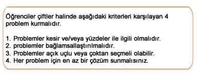 Sıla öğretmen, 9. sınıflarından biriyle kesirleri ve yüzdeleri gözden geçirmek istedi. Bu nedenle sınıfça çözmek için öğrencilerden bazı problemler kurmalarını istemeye karar verdi.